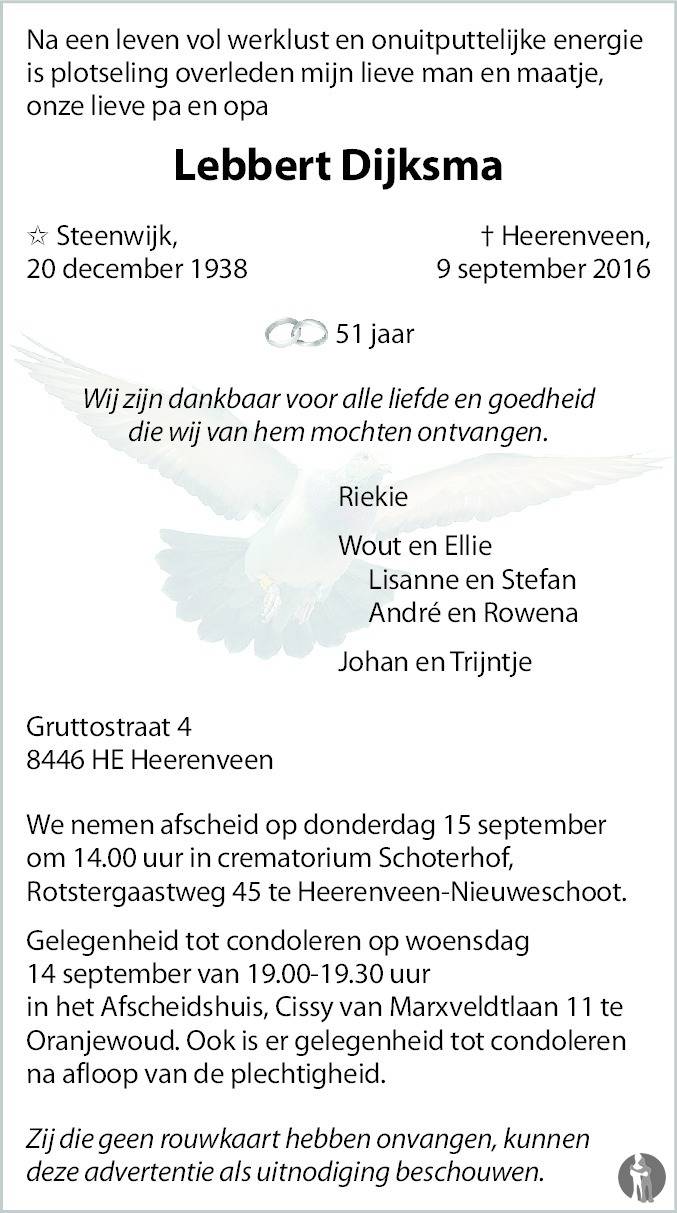 In de nacht van afgelopen donderdag op vrijdag is onze duivensportvriend Libbe Dijksma plotseling overleden.