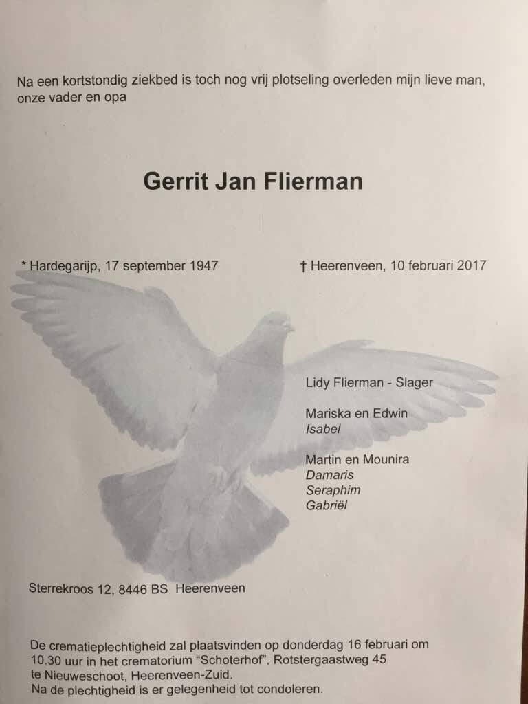 In de namiddag van vrijdag 10 februari is na een kort ziektebed Gerrit Flierman op 69 jarige leeftijd overleden.
